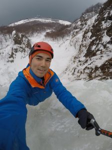 若手ガイドのホープ・井坂道彦ガイドと雪の「点の記山頂」に立ちます。